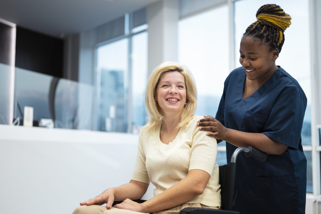 Person with chronic disability in waiting room at health center facility, wheelchair user waiting to attend checkup appointment. Man with physcal impairment doing consultation at medical clinic.